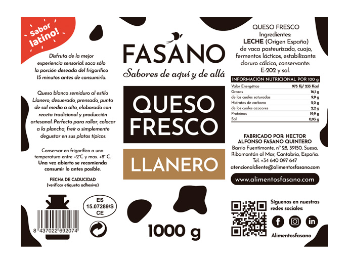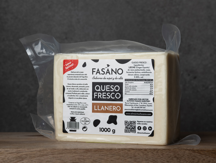 Nuestro Queso Fresco tipo Llanero, forma parte de los quesos denominados «Latinos» en España, se crea con leche fresca de vaca pasteurizada de Cantabria, recogida a diario por nosotros. Utiliza la técnica del llano venezolano y se elabora de manera artesanal, manteniendo su carácter natural y tradicional.